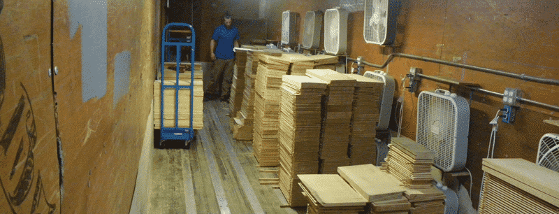 This is the case for any products with reasonable mass, (e.g. cello fronts, archtop guitar wedges, mandolin wedges, block stock and flute stock, etc.). Once sealed all products are individually stickered and immediately stored in one of our drying chambers to achieve a 7 to 10 percent moisture content. If these measures are not taken the products are susceptible to mold spores, causing blue stains and degradation.